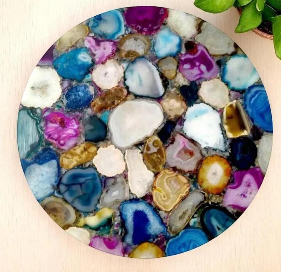 ท็อปโต๊ะกาแฟหินอาเกตหลากสีทรงกลม งานแฮนด์เมดสั่งทำพิเศษ เฟอร์นิเจอร์หรูหราจากหินกึ่งมีค่าสำหรับสวน