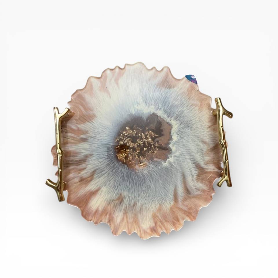 ถาดหินอาเกตธรรมชาติทรงกลม ดีไซน์ตกแต่งด้วยคริสตัลตรงกลาง และหูจับรูปกิ่งไม้สีทองแกะสลัก