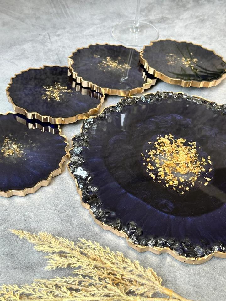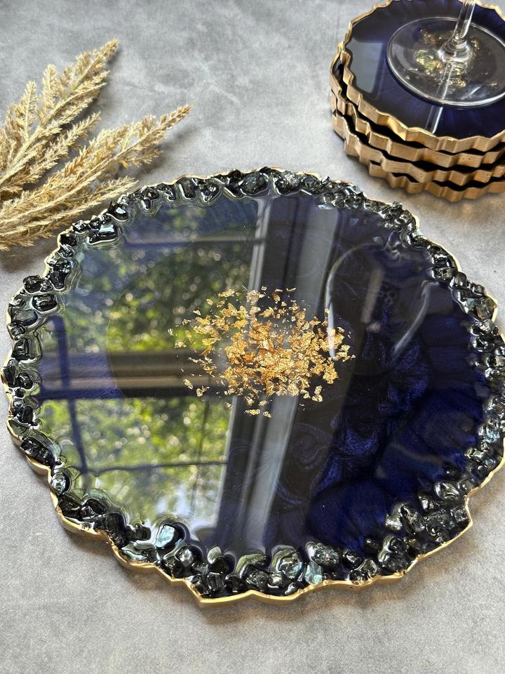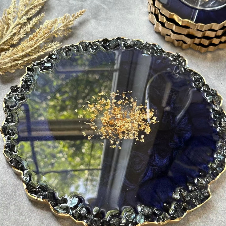 ถาดเรซิ่นสีกรมท่าทรงกลมขอบคริสตัลบดและกลางทองถาดขอบหยักหรูหราสำหรับตกแต่งโต๊ะจากอินเดีย