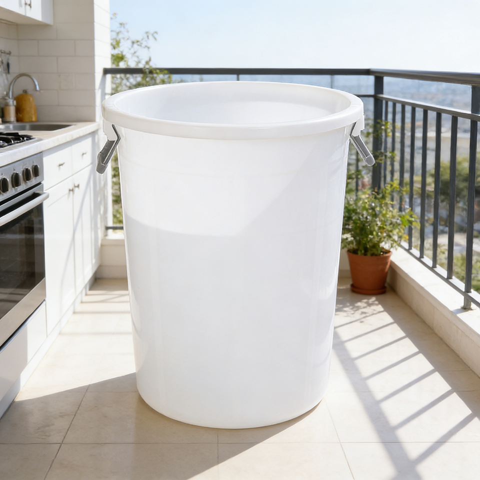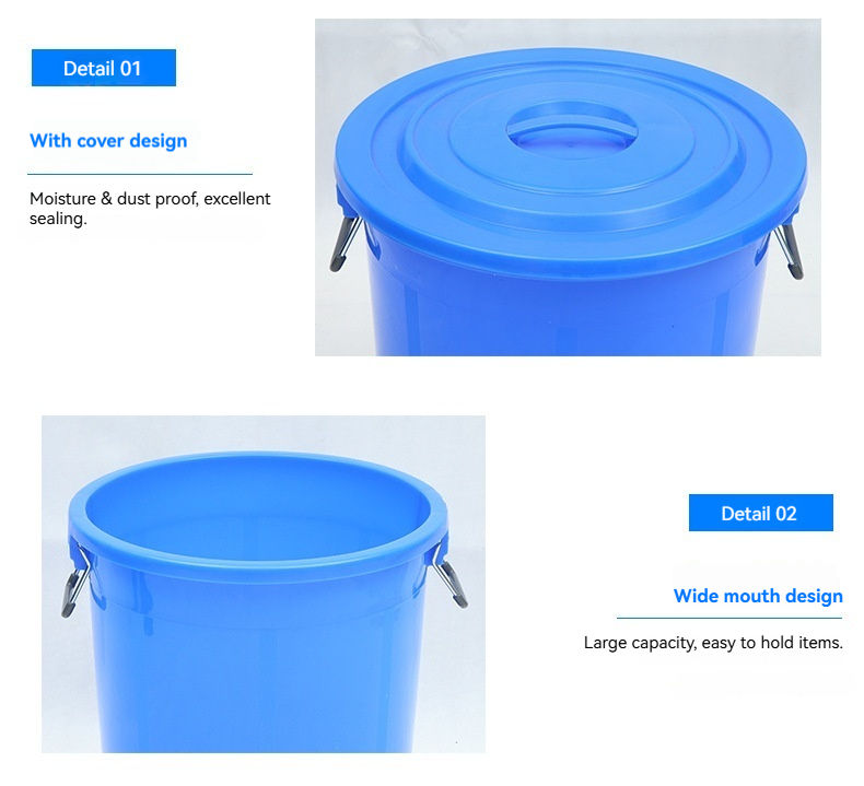 ถังพลาสติกทรงกลมพร้อมหูจับเหล็ก ดีไซน์ใช้งานได้หลากหลาย ผลิตด้วยวิธีฉีดขึ้นรูป เหมาะสำหรับจัดเก็บในโรงงาน