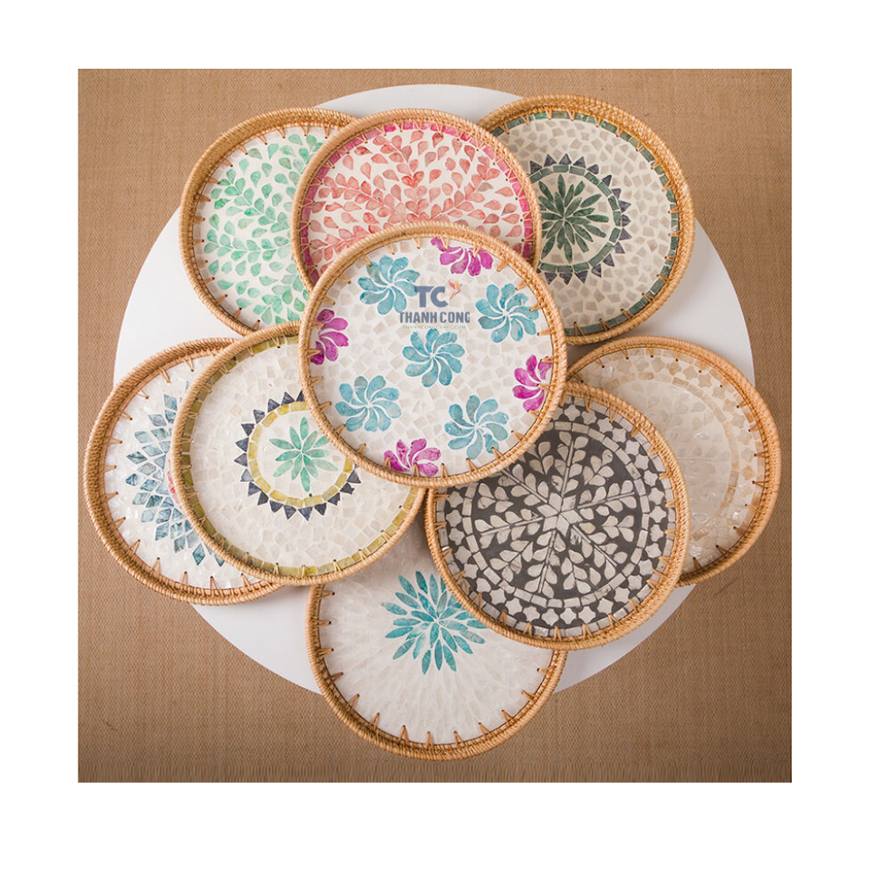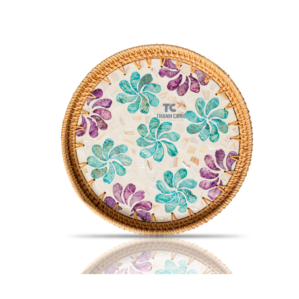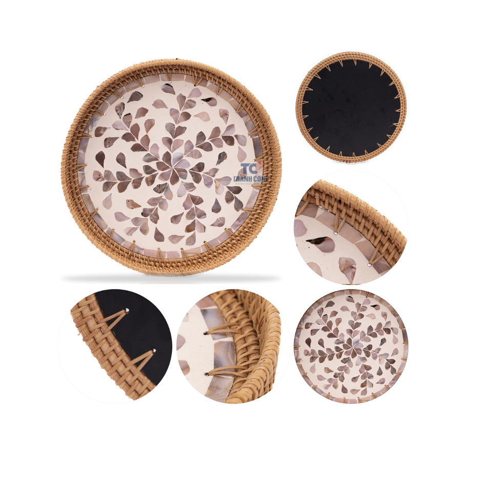 ถาดหวายทรงกลมถาดเสิร์ฟประดับมุกสำหรับโต๊ะกาแฟอาหารเช้าของตกแต่งบ้าน