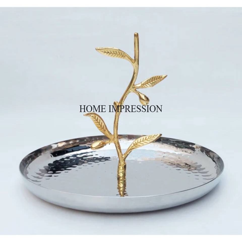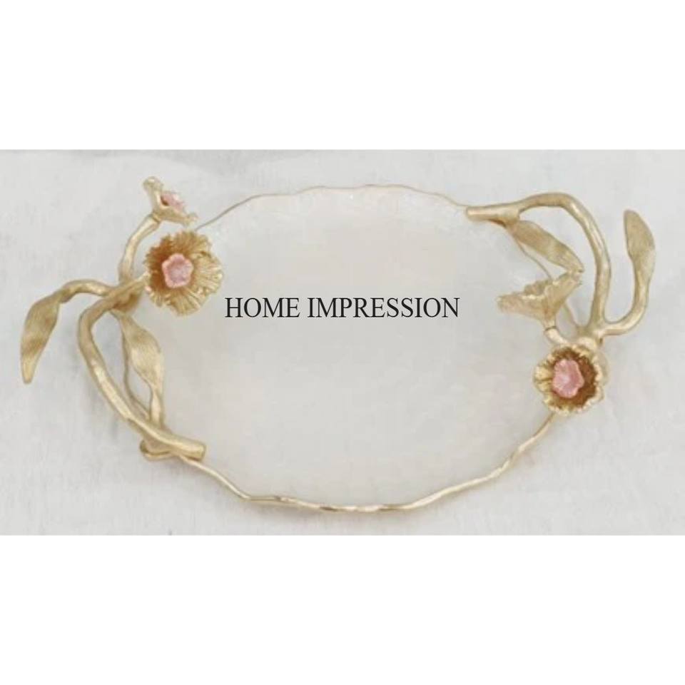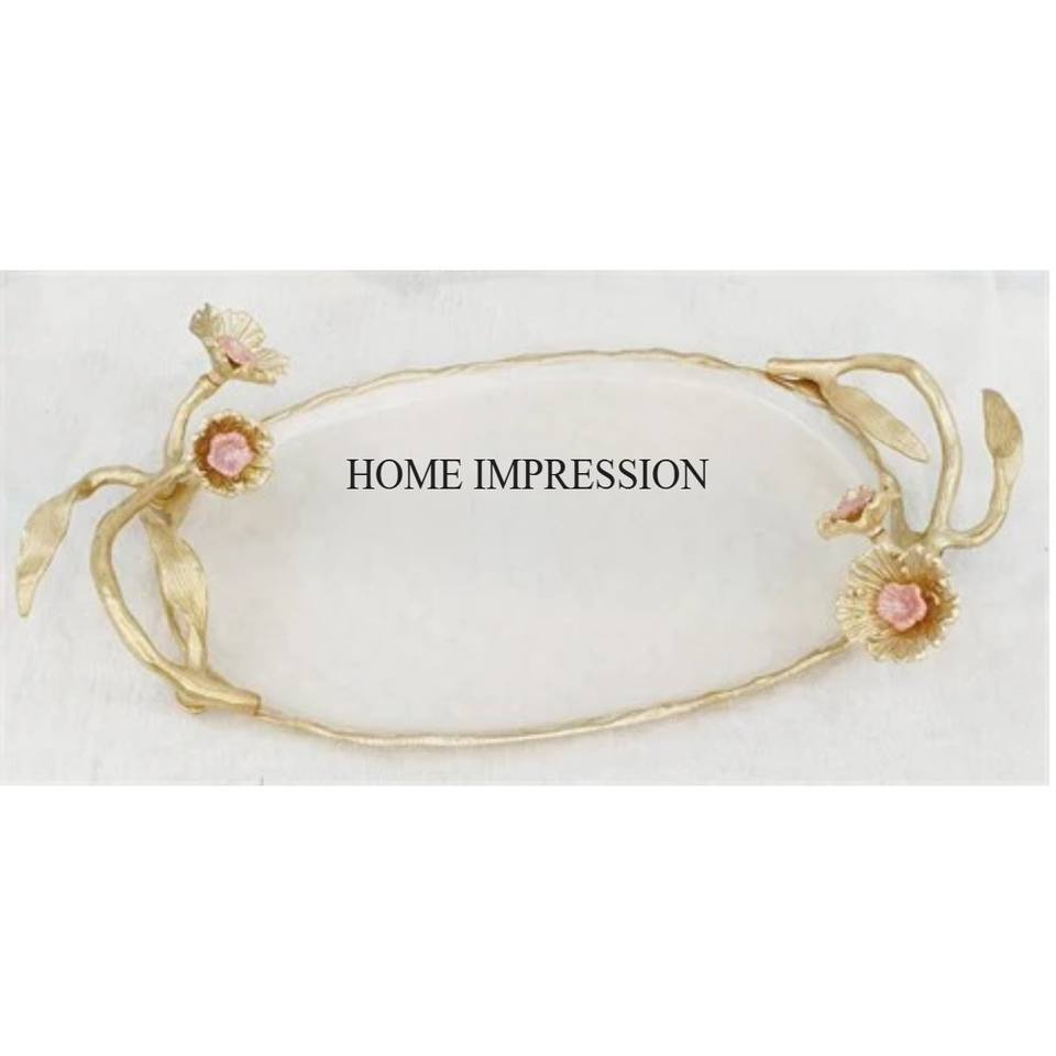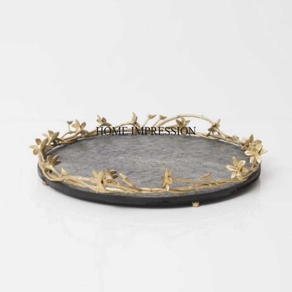 ถาดเสิร์ฟทำจากหินอ่อนทรงกลมพร้อมดอกไม้โลหะชุบทองสำหรับงานแต่งงานและวิลล่าอุปกรณ์โต๊ะอาหาร