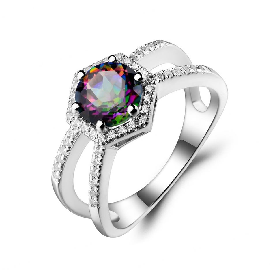 แหวนแต่งงานพลอยมิสติกโทแพซทรงกลม เครื่องประดับแต่งงานเงินสเตอร์ลิง