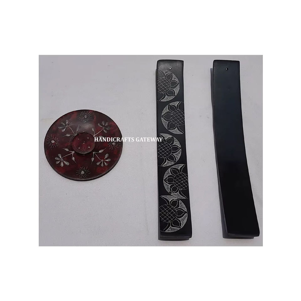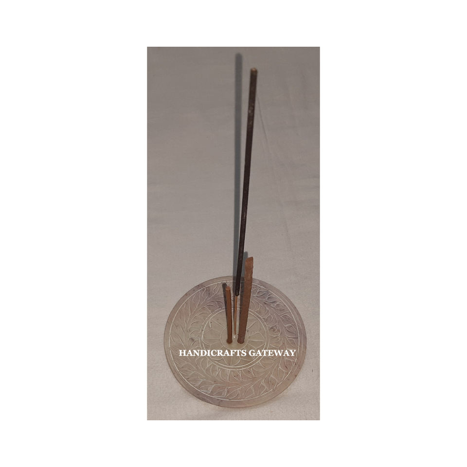 แท่นวางธูปทรงกลมทำจากหินสบู่ธรรมชาติ ทนทานและมีผิวเงางาม ดีไซน์ลายดอกไม้ ทำด้วยมือ ใช้สำหรับวางธูปในบ้าน