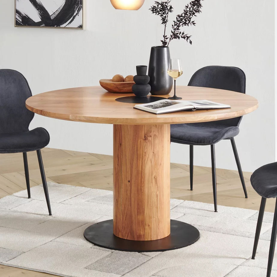 โต๊ะอาหารทรงกลม หน้าไม้เนื้อแข็งอะคาเซีย ฐานตั้งทรงโดดเด่น สีดำและสีธรรมชาติ สำหรับบ้าน ห้องครัว ร้านอาหาร