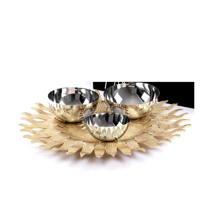 ชามทองเหลืองทรงกลมพร้อมชุดสองชิ้นนำสัมผัสศิลปะที่เป็นเอกลักษณ์สำหรับงานนำเสนออาหารที่บ้านและมีสไตล์