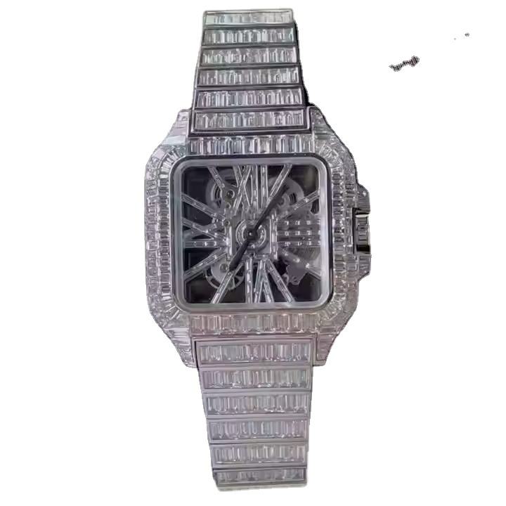 นาฬิกานักดำน้ำคลาสสิกฮิปฮอปทรงมนพร้อมบาแกตต์ตัดเพชรโมอิสซาไนต์ลายโครงกระดูกที่เป็นเอกลักษณ์สายสแตนเลส