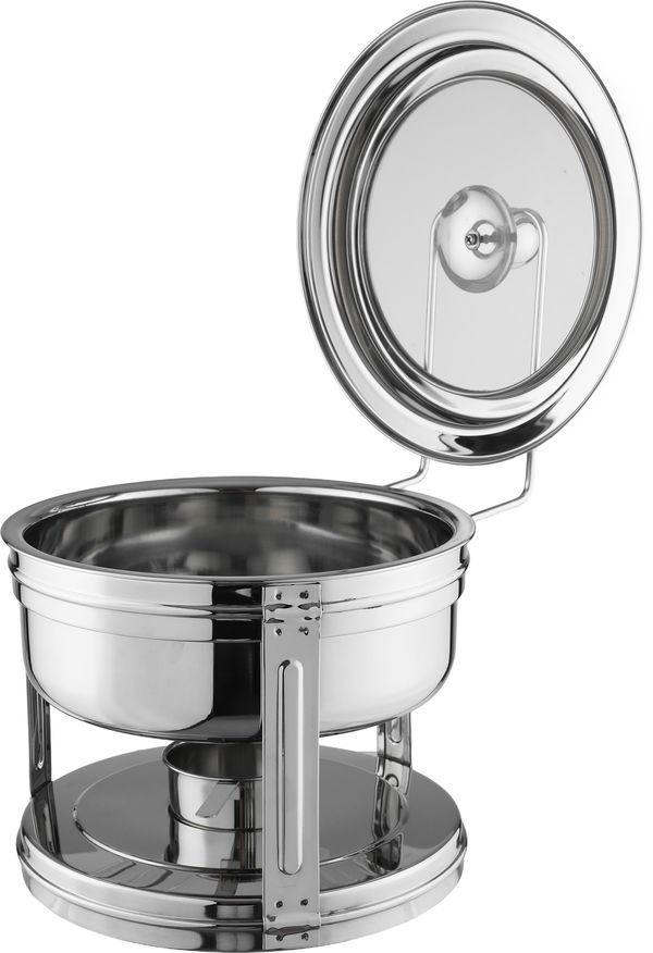 ถาดอุ่นอาหารสแตนเลสทรงกลม พร้อมฝาปิดแบบมีที่จับ ขัดเงาอย่างดี เหมาะสำหรับโรงแรม ร้านอาหาร งานจัดเลี้ยง และงานปาร์ตี้