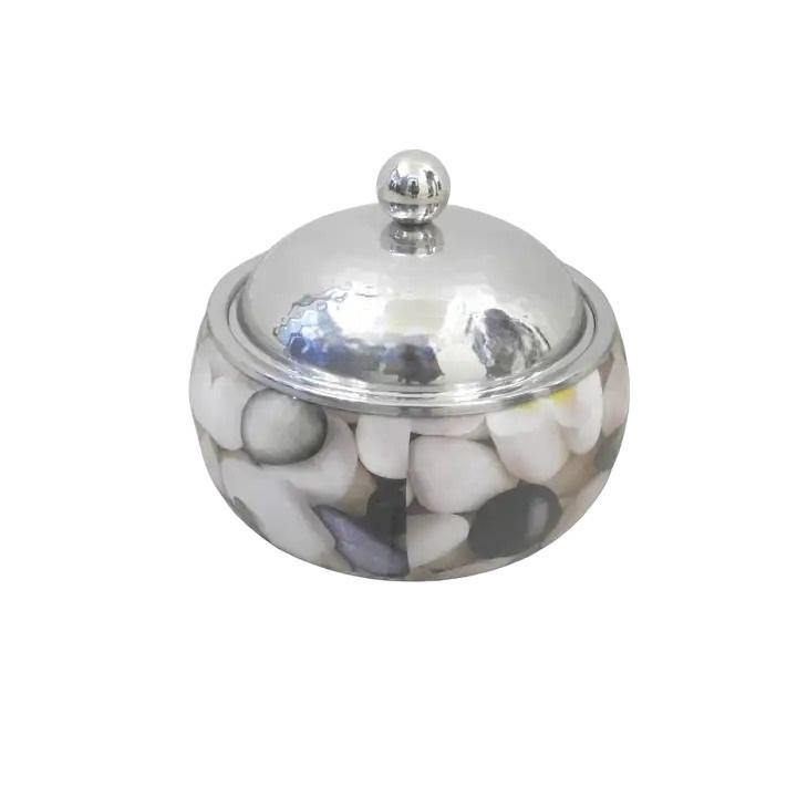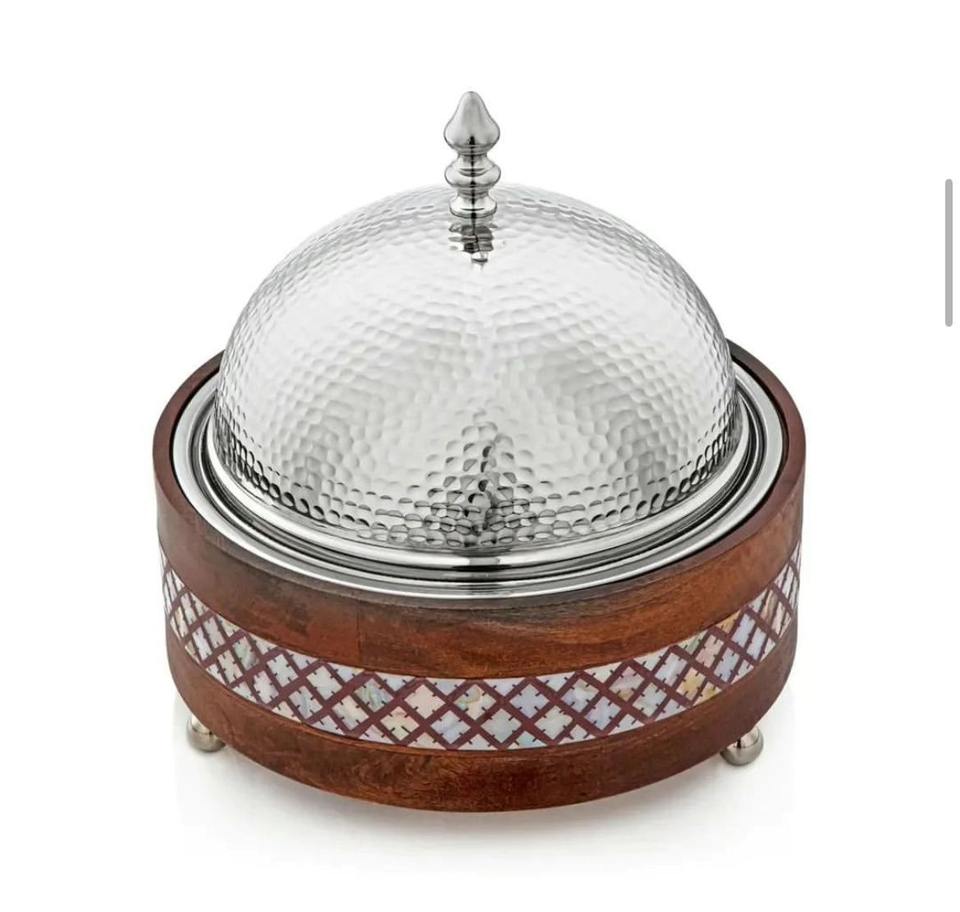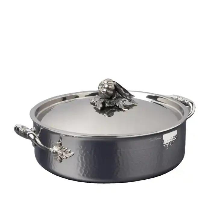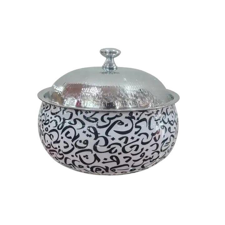 หม้อร้อนพร้อมฝาปิดลายดอกไม้ทำจากสแตนเลสทรงกลมมีฝาปิดสำหรับวางบนโต๊ะ