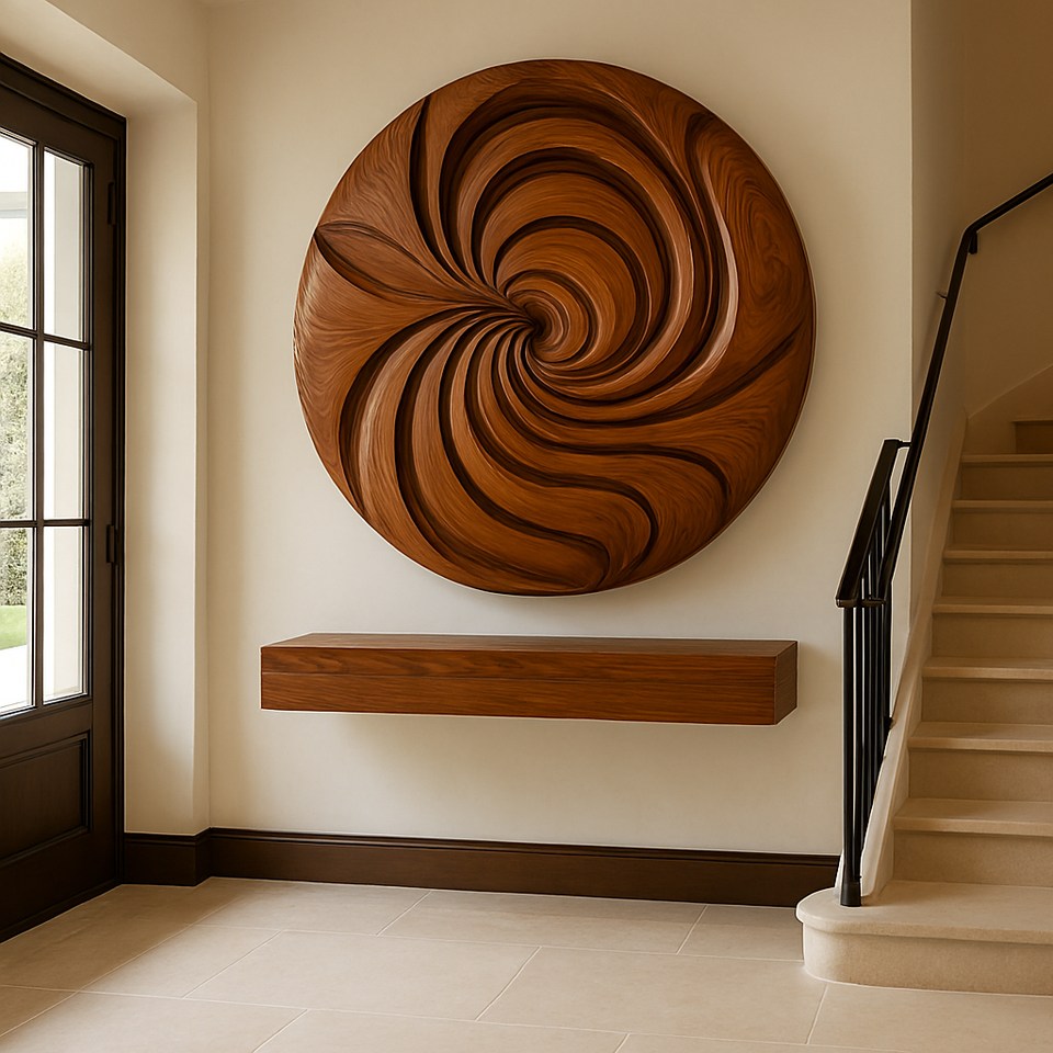 งานแกะสลักไม้ติดผนังรูปทรงกลม ลายคลื่น งานศิลปะตกแต่งผนังแบบออร์แกนิกสมัยใหม่ งานแกะสลักไม้ติดผนังแบบนามธรรม