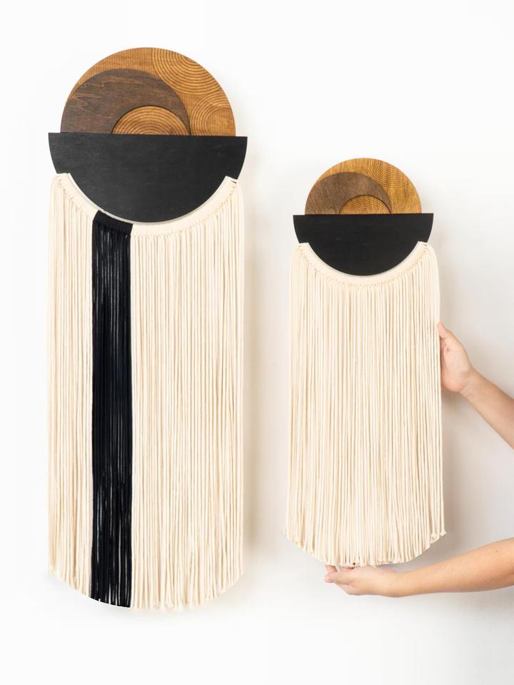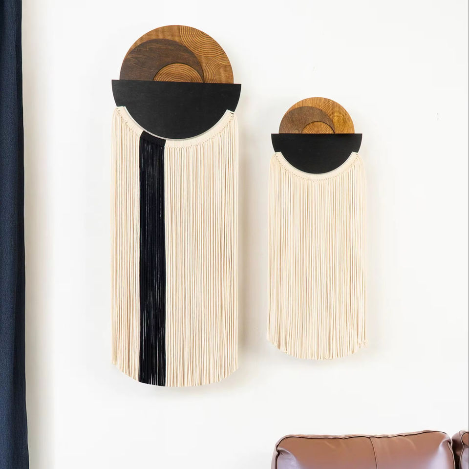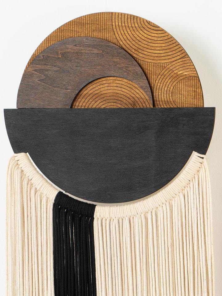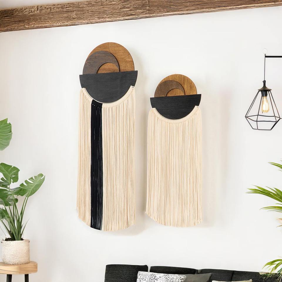 กรอบไม้ทรงกลมตกแต่งผนังด้วยงานถักมาคราเม่ สีดำและสีขาว เหมาะสำหรับตกแต่งห้องนอน ห้องนั่งเล่น และทางเข้าบ้าน ขายส่งจากอินเดีย