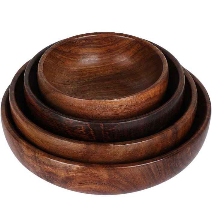 ชามเสิร์ฟทำจากไม้ทรงกลมสำหรับสลัดผลไม้และของตกแต่งบ้านชามผลไม้ทำจากไม้พร้อมช้อนเป็นมิตรกับสิ่งแวดล้อม