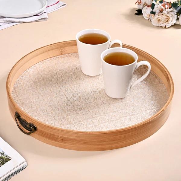 ถาดเสิร์ฟทำจากไม้ทรงกลมพร้อมด้ามจับที่สวยงามทนทานเหมาะสำหรับการเสิร์ฟชากาแฟอาหารเช้าและงานเลี้ยง