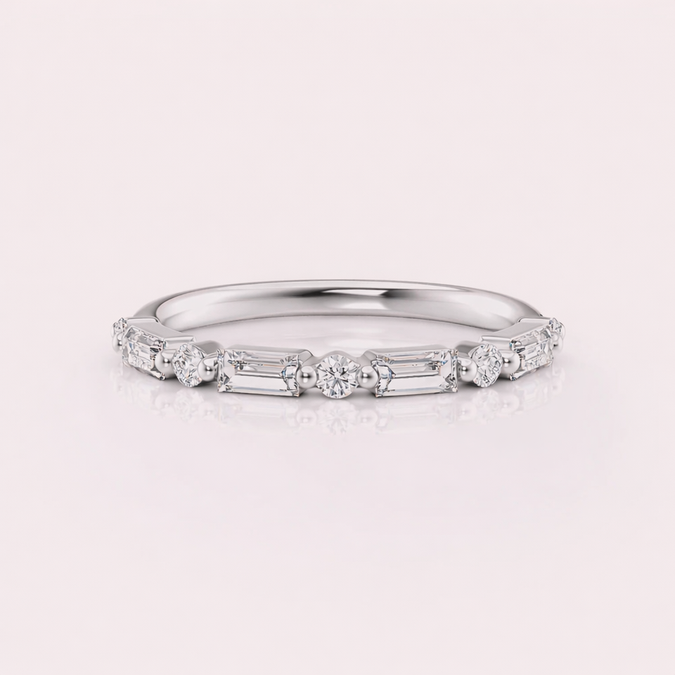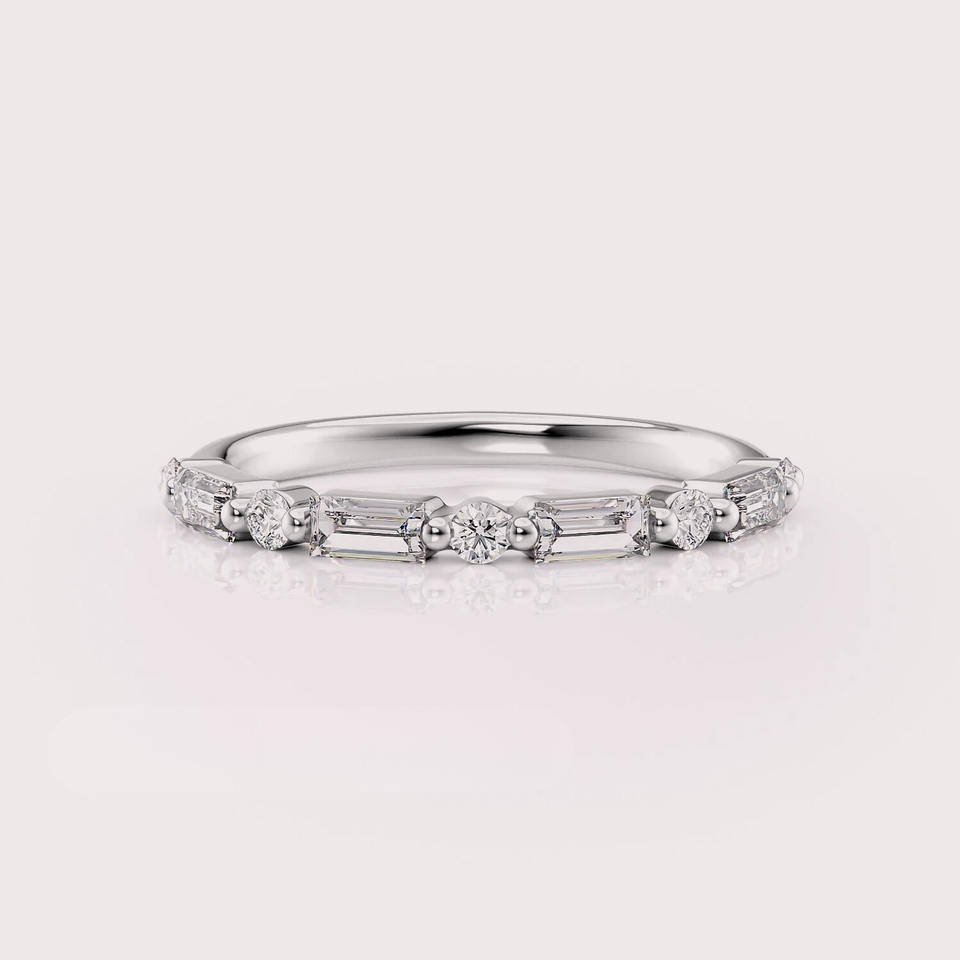 แหวนแต่งงานเพชรทรงบาแกตต์เพาะเลี้ยงในห้องปฏิบัติการ ได้รับการรับรองจาก IGI ตัวเรือนเงินแท้ 925 ชุบโรเดียม ดีไซน์หรูหรา