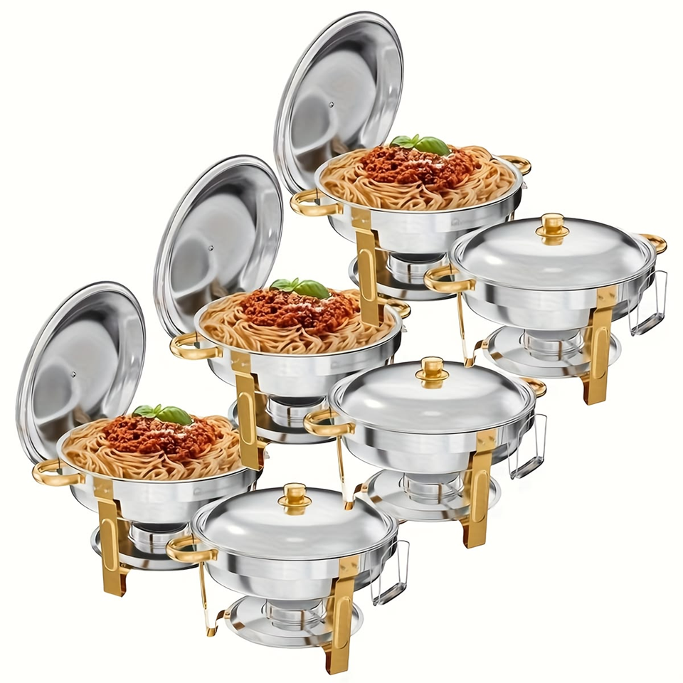 ถาดอุ่นอาหารทรงกลมชุบทองพร้อมฝาปิดกระจกและขาตั้งแข็งแรง มีจำหน่ายในราคาขายส่ง