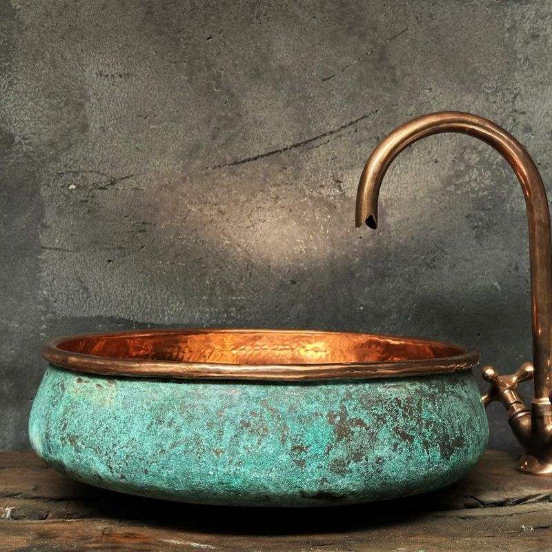 อ่างทองแดงทรงกลมแบบตอก เหมาะสำหรับติดตั้งในอ่างล้างจานแบบฟาร์มเฮาส์ ให้ความรู้สึกหรูหราแบบชนบทที่เป็นเอกลักษณ์