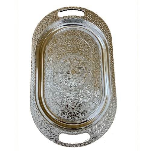 ถาดโลหะเงินทรงกลมทรงกลมสำหรับใช้ในครัวและโต๊ะเสิร์ฟอาหารอร่อยและทะเลทราย