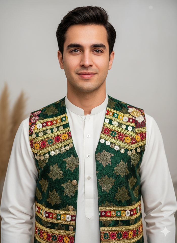 ชุดเจ้าสาวผ้ากำมะหยี่แบบดั้งเดิมของราชวงศ์อัฟกานิสถานมีงานปักกระจกและชุด dupatta สีเขียว