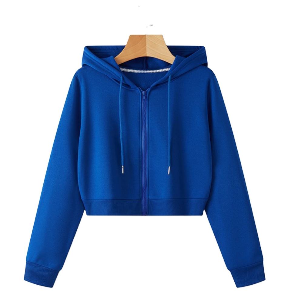 เสื้อฮู้ดมีซิปสีฟ้ารอยัลเข้ารูปแจ็คเก็ตขนแกะผ้าฝ้ายผู้หญิงความยาวสั้นลำลองสตรีทแวร์แฟชั่นฤดูหนาวที่กำหนดเองได้