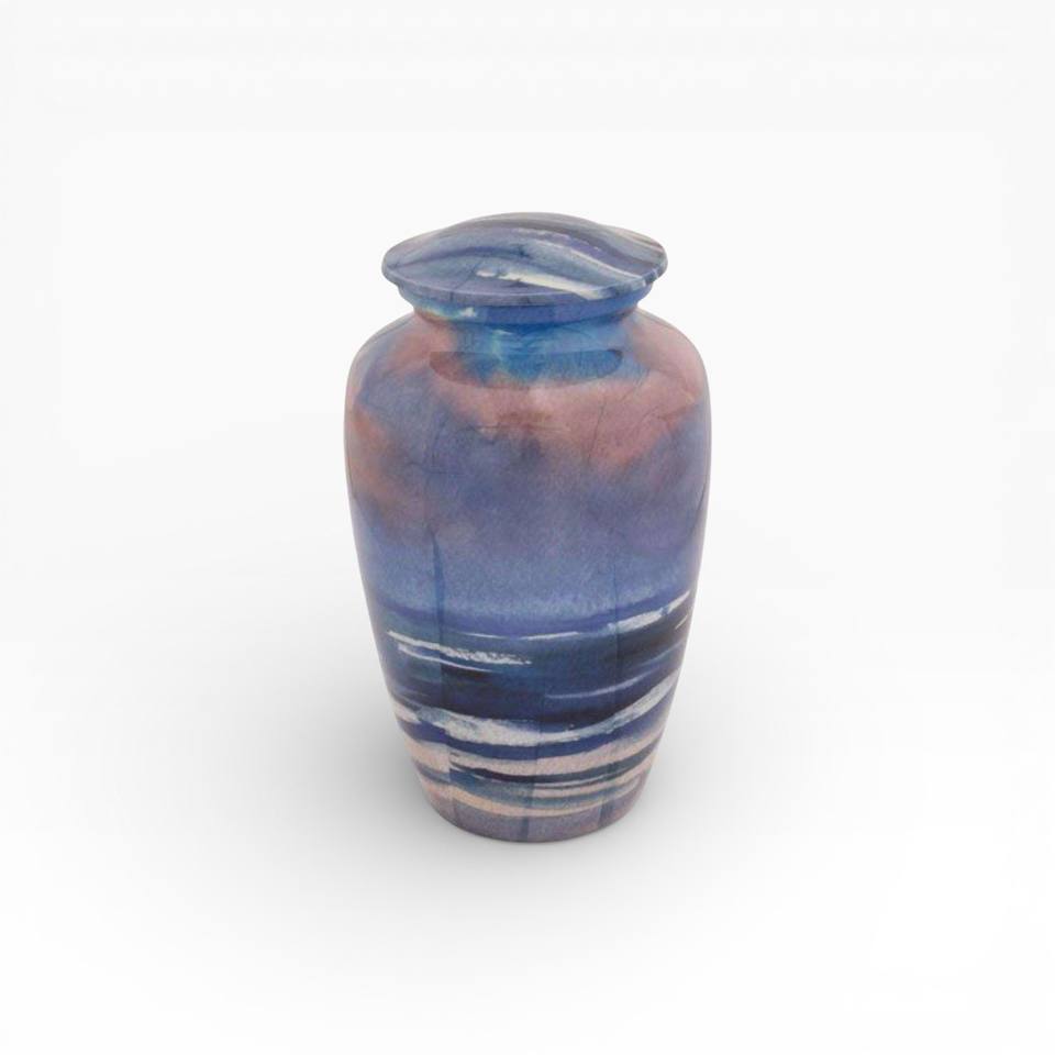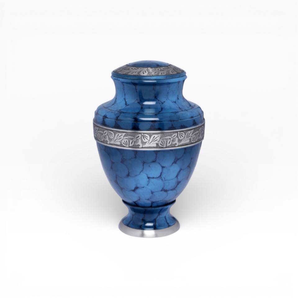 โกศบรรจุอัฐิหินอ่อนสีน้ำเงินรอยัล พร้อมฝาปิดตกแต่งลายดอกไม้สีเงิน และดีไซน์ที่ระลึกที่หรูหรา