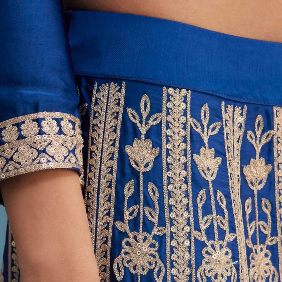 ชุดกระโปรงผ้าไหมสีฟ้าราชวงศ์พร้อมผ้าแพรซาริและเลื่อมชุดทำงานขายส่งเครื่องแต่งกายพื้นเมืองออกแบบได้ตามต้องการสำหรับงานแต่งงาน