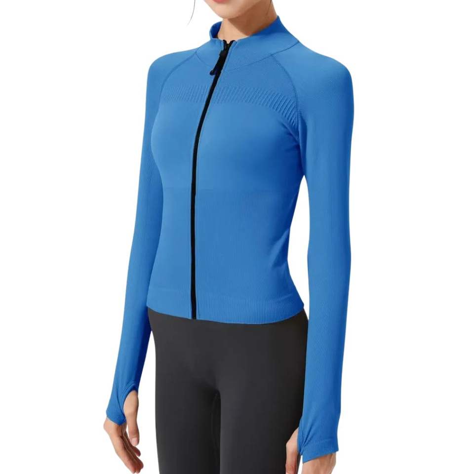 เสื้อแจ็คเก็ตโยคะทรงสลิมฟิตสีน้ำเงินรอยัลสำหรับผู้หญิง ซิปยาว ยืดหยุ่นสูง คอเต่า แขนยาว