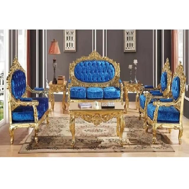 ชุดโซฟาห้องนั่งเล่นสไตล์วินเทจสีน้ำเงินรอยัล ดีไซน์หรูหราสำหรับมืออาชีพ พร้อมลายแกะสลักไม้สักสีทองโบราณ คุณภาพทนทาน