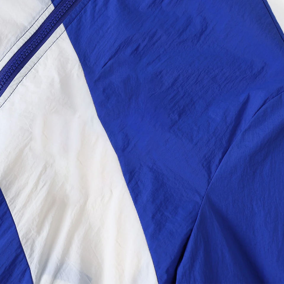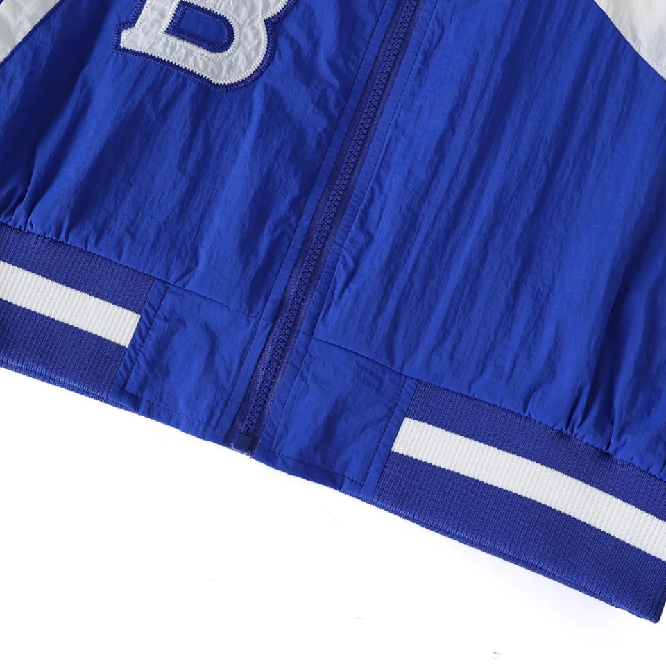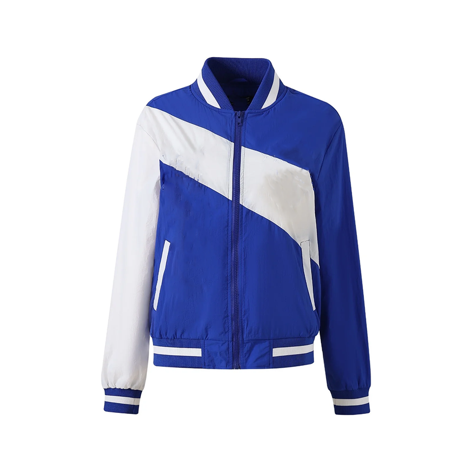 เสื้อแจ็คเก็ตบอมเบอร์แบบมีซิปเต็มตัว สีฟ้ารอยัลบลู ลายพิมพ์สีขาว คอตั้ง น้ำหนักเบา กันลม มีกระเป๋าหน้า ไซส์พลัส
