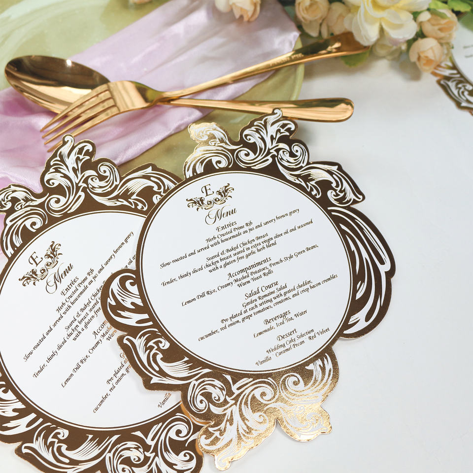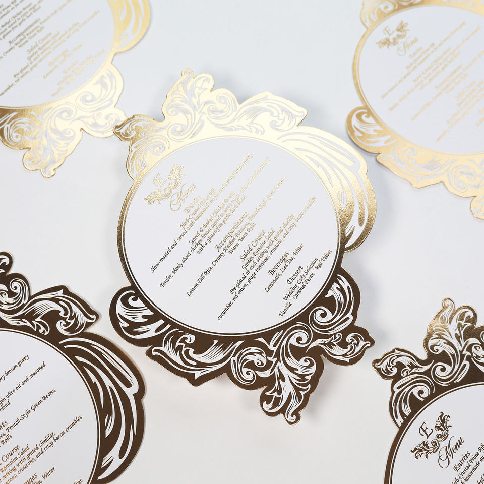 บัตรเมนูงานแต่งงานฟอยล์สีทองตรารอยัลออกแบบโลโก้ได้ตามต้องการ