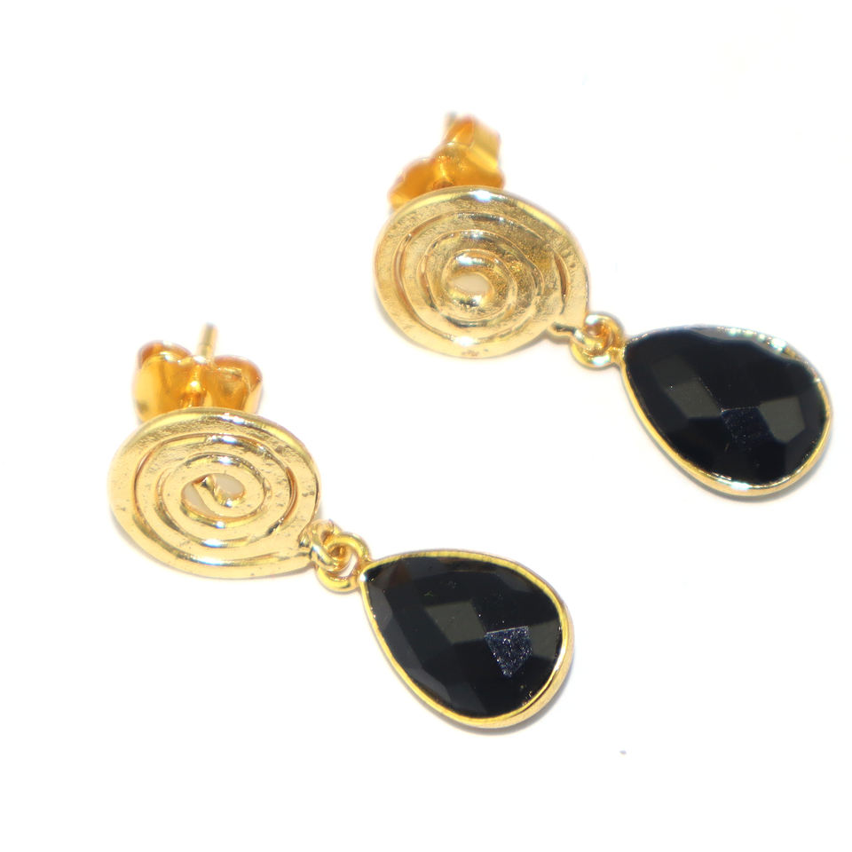 ต่างหูทรงหยดน้ำประดับด้วยหินออนิกซ์สีดำทรงลูกแพร์แบบไฮโดรควอตซ์ ดีไซน์เกลียวลวด ชุบทอง 22K ตัวเรือนทองเหลือง