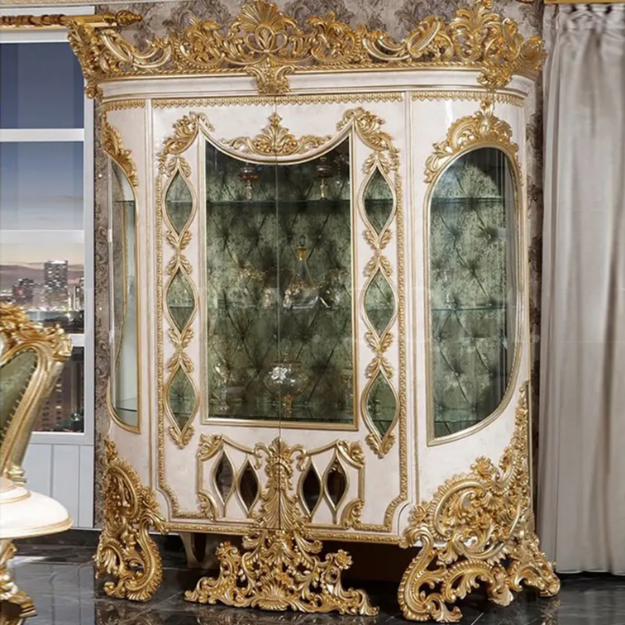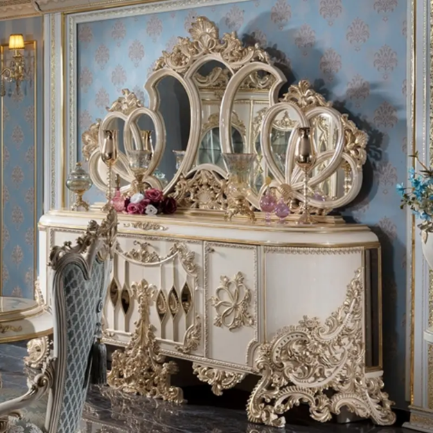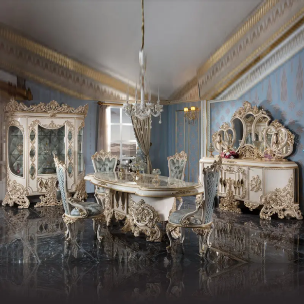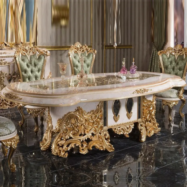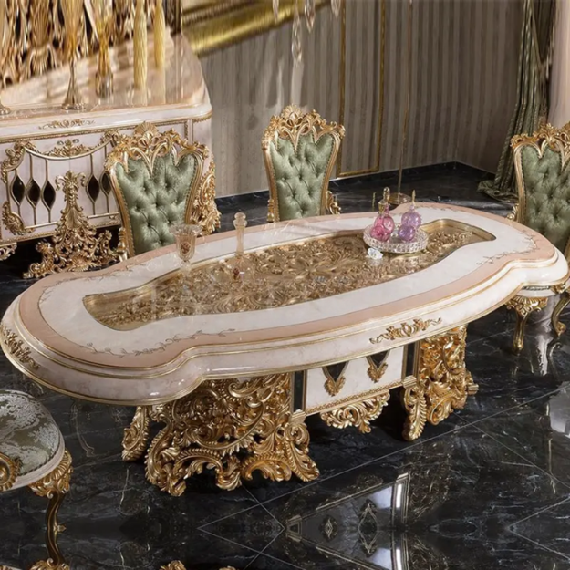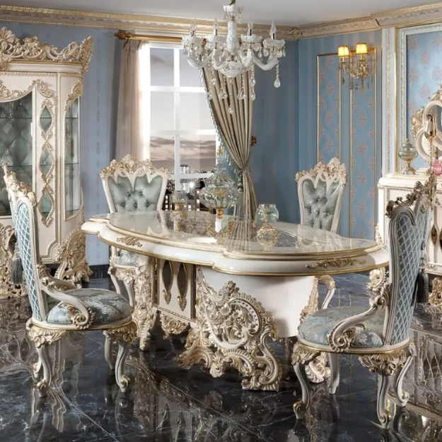 ชุดโต๊ะรับประทานอาหารสไตล์โรโคโคฝรั่งเศสสุดหรูหรา พร้อมตกแต่งด้วยสีงาช้างและทอง เหมาะสำหรับห้องรับประทานอาหารในวิลล่าหรือโรงแรม