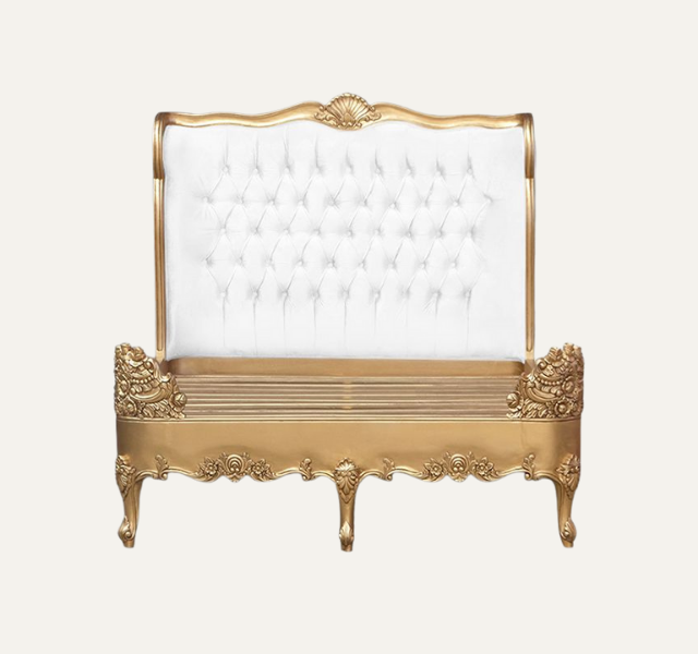 เตียงหุ้มเบาะสไตล์ฝรั่งเศสแบบประกอบสำเร็จ พร้อมหัวเตียงไม้มะฮอกกานีแบบติดกระดุม ขนาดคิงไซส์ เฟอร์นิเจอร์ห้องนอน