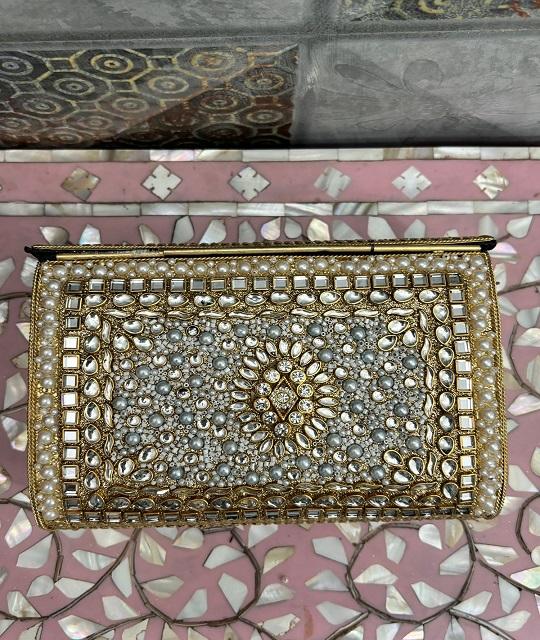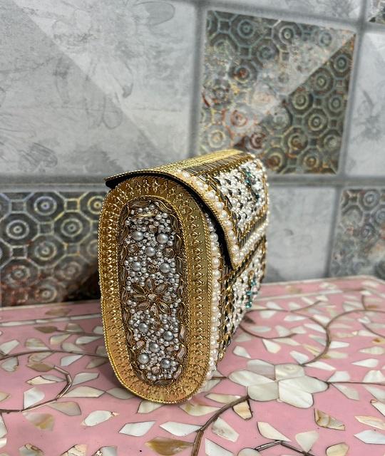 กระเป๋าคลัทช์ถือประดับด้วยหินคุณภาพสูงแบบรอยัลโกลด์คุนดัน พร้อมพู่ห้อยคริสตัลสุดหรู