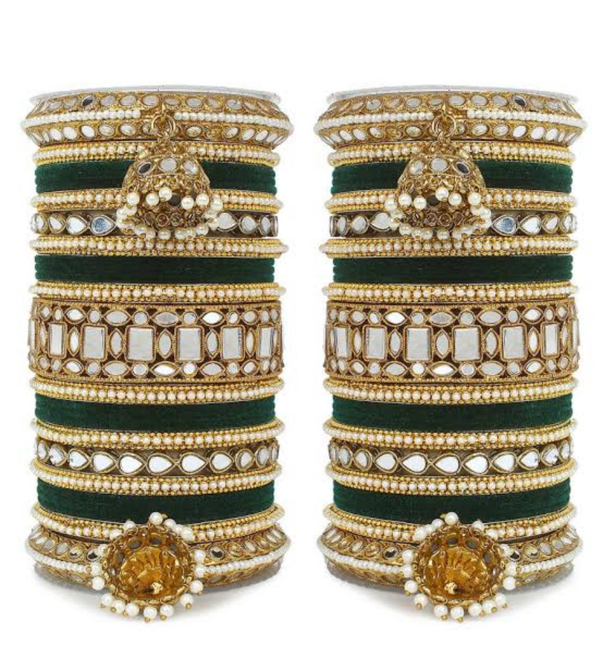ชุดเจ้าสาวสีเขียวเข้มและสีทองพร้อมงาน Kundan และ kaleerein กำไลแต่งงานแบบดั้งเดิมของอินเดีย