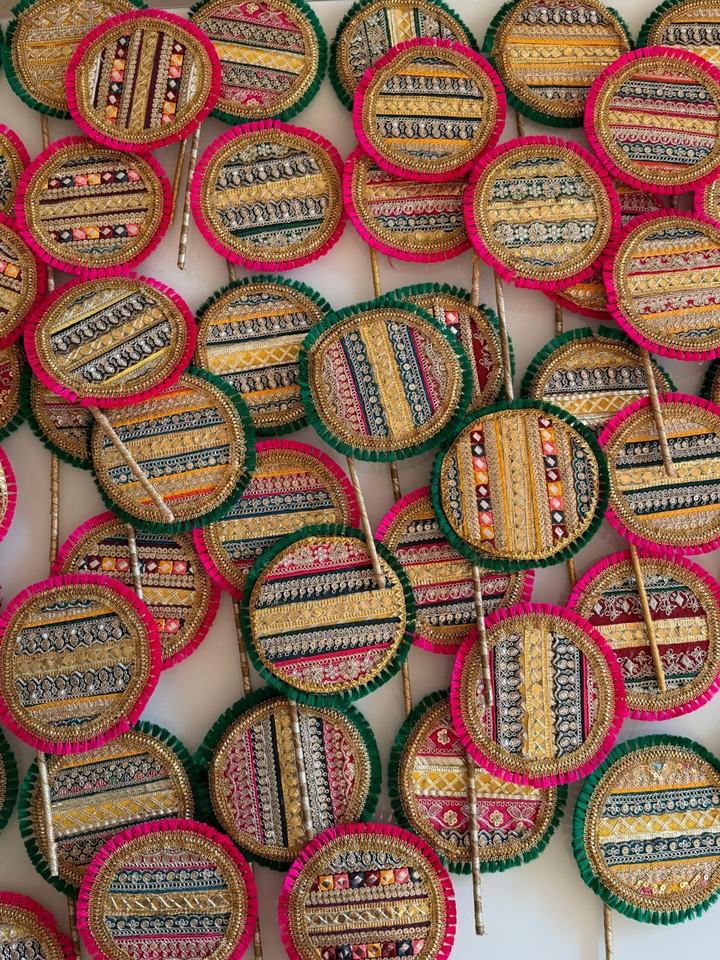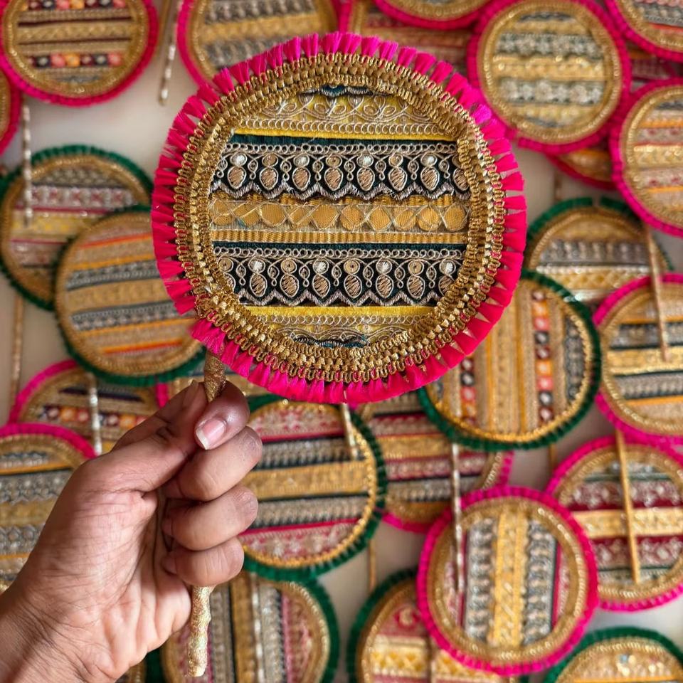 Royal Handcrafted Festive Decorative Fans with Traditional Embroidery Zari Work Mirror Detailing and Vibrant Pink Green Borders
