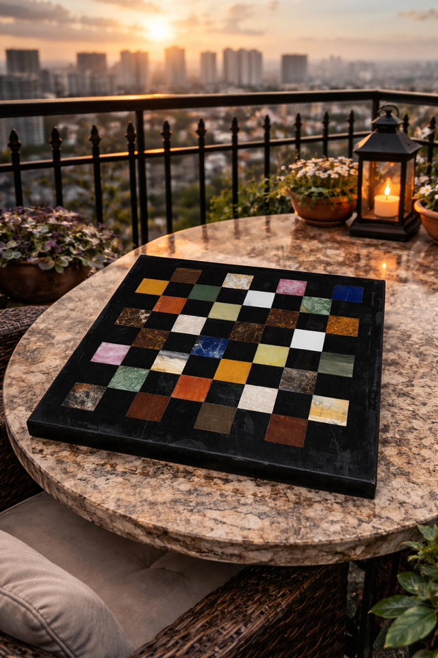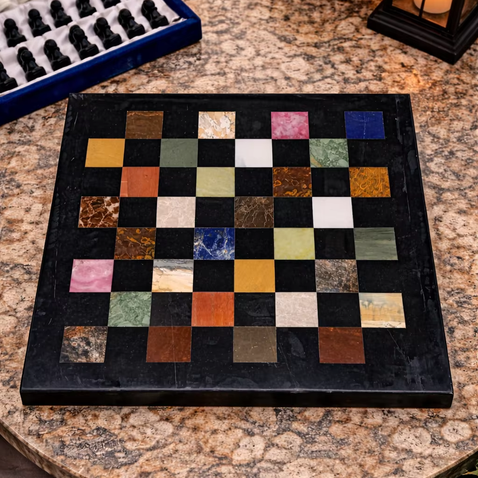 ชุดหมากรุกหินหรูหราสไตล์ราชวงศ์ ผลงานแกะสลักด้วยมือระดับปรมาจารย์ คอลเลกชันหมากรุกพรีเมียม กระดานหมากรุกฝังลายหลากสี