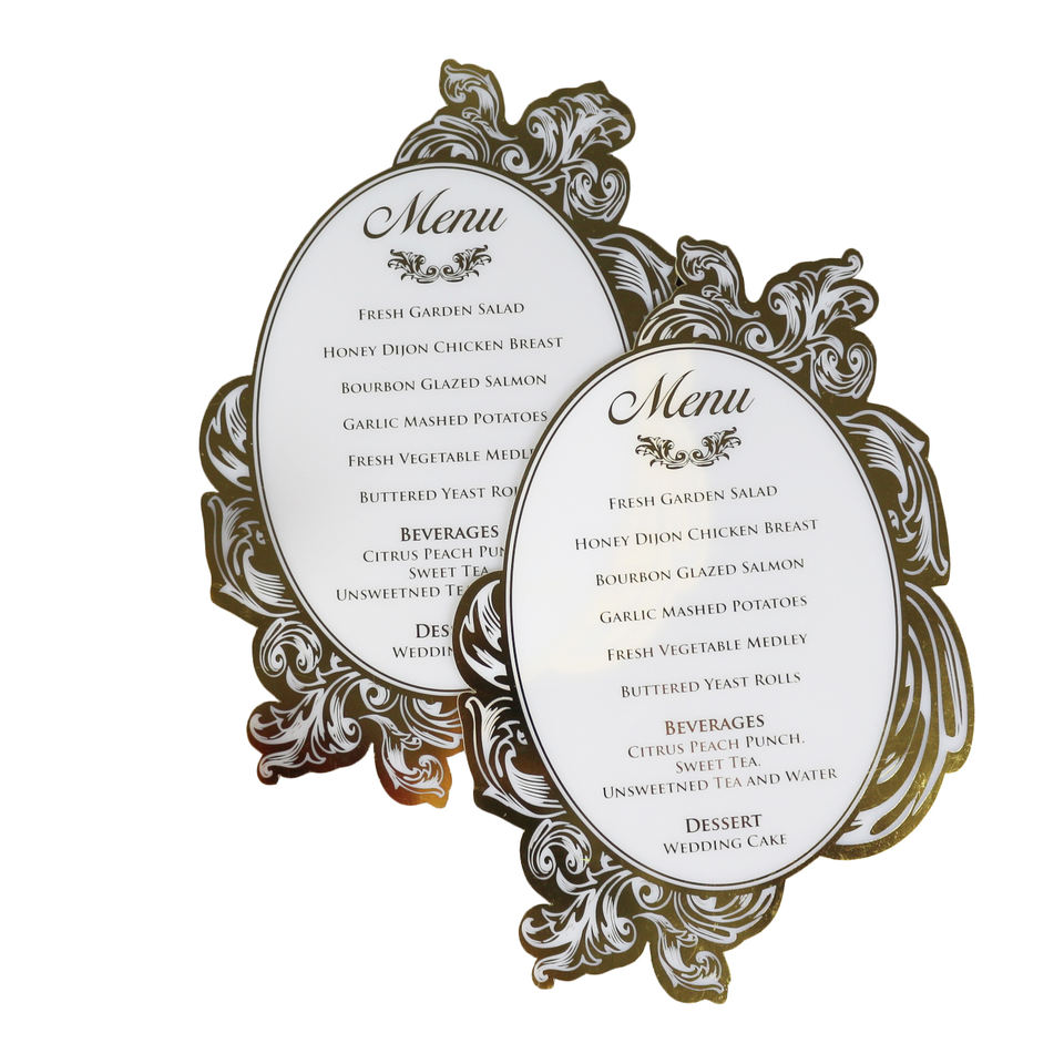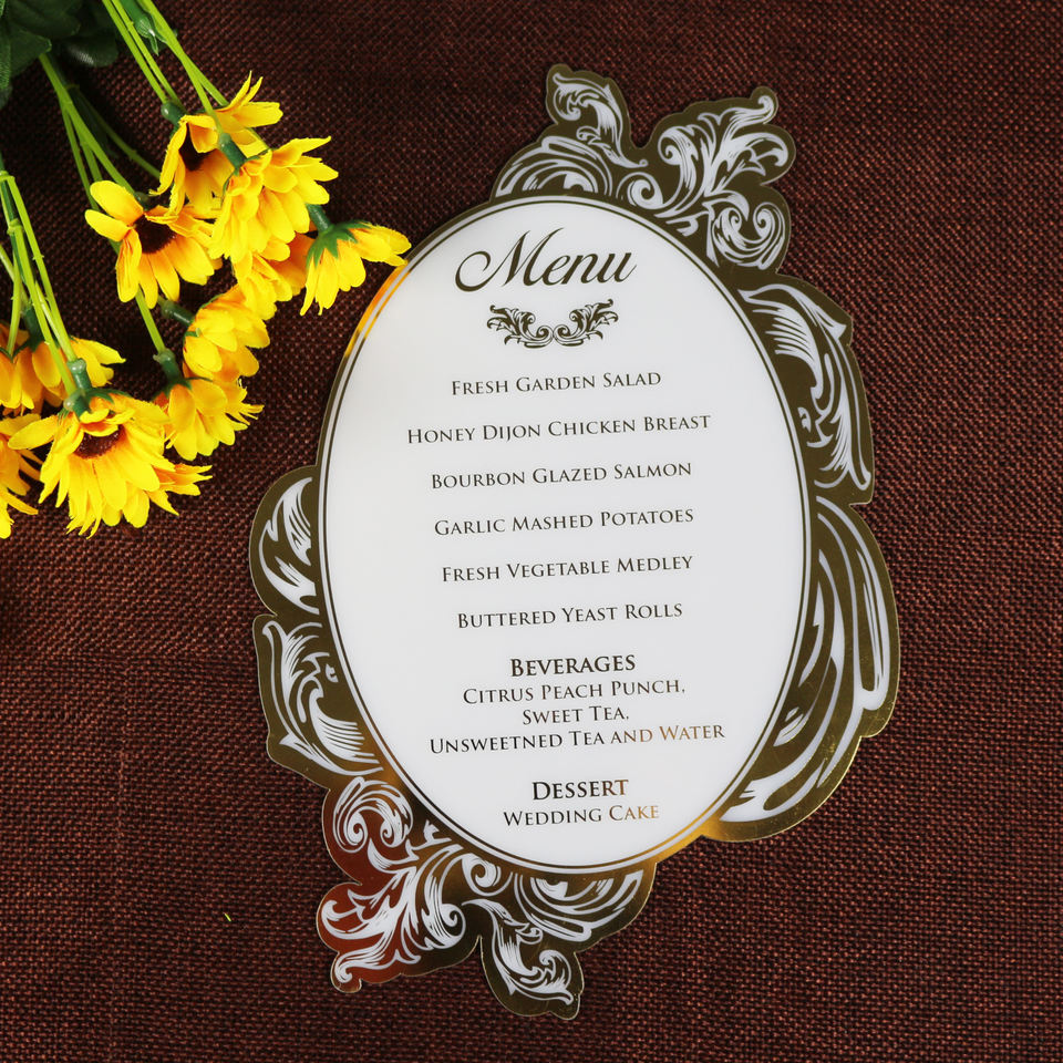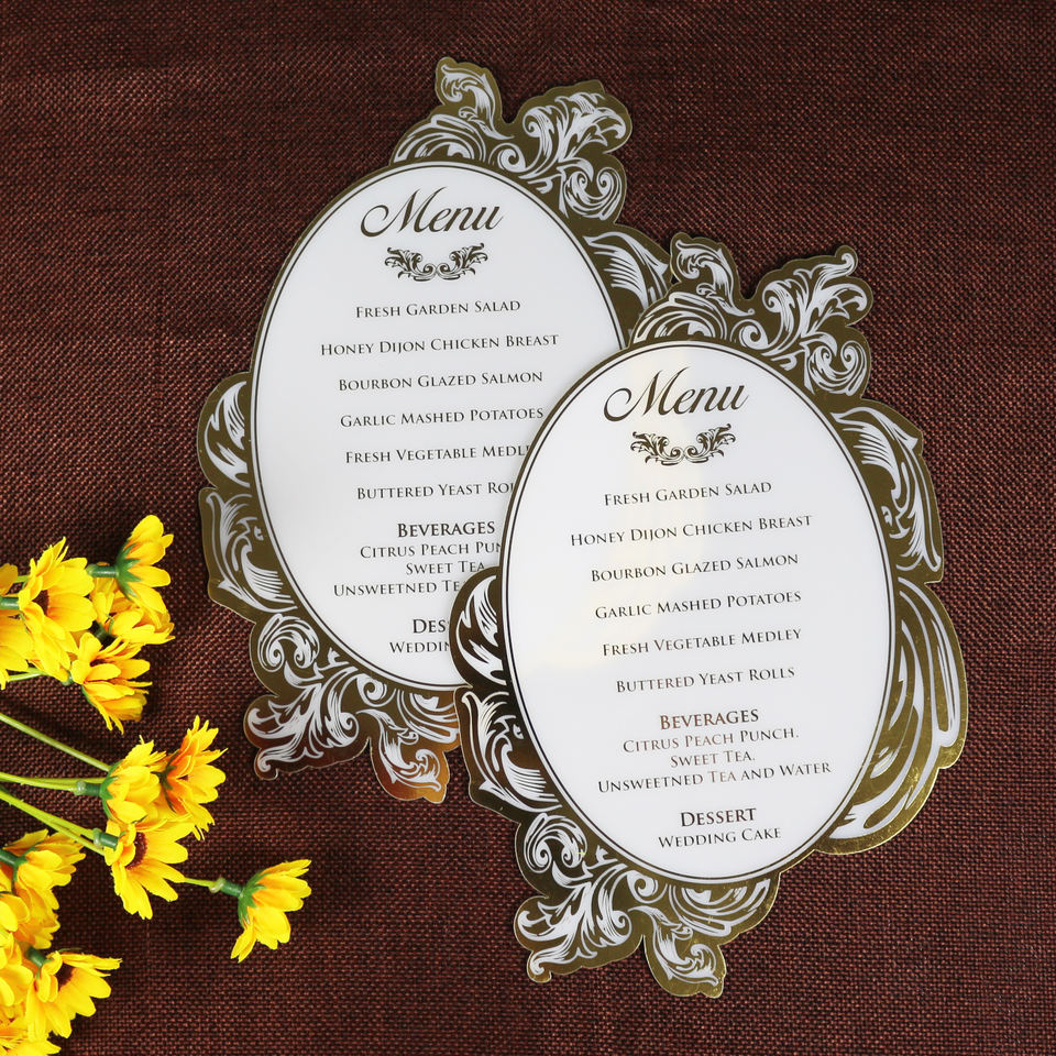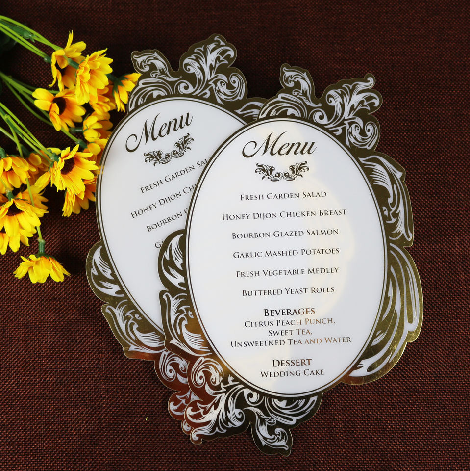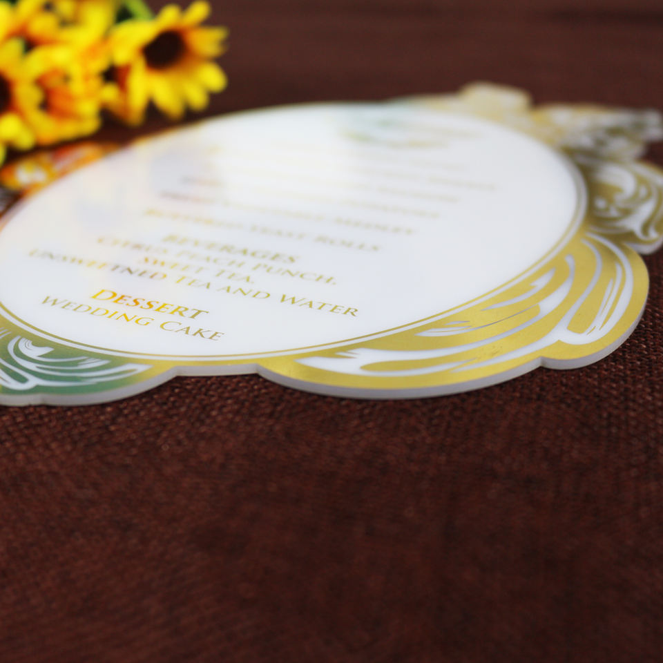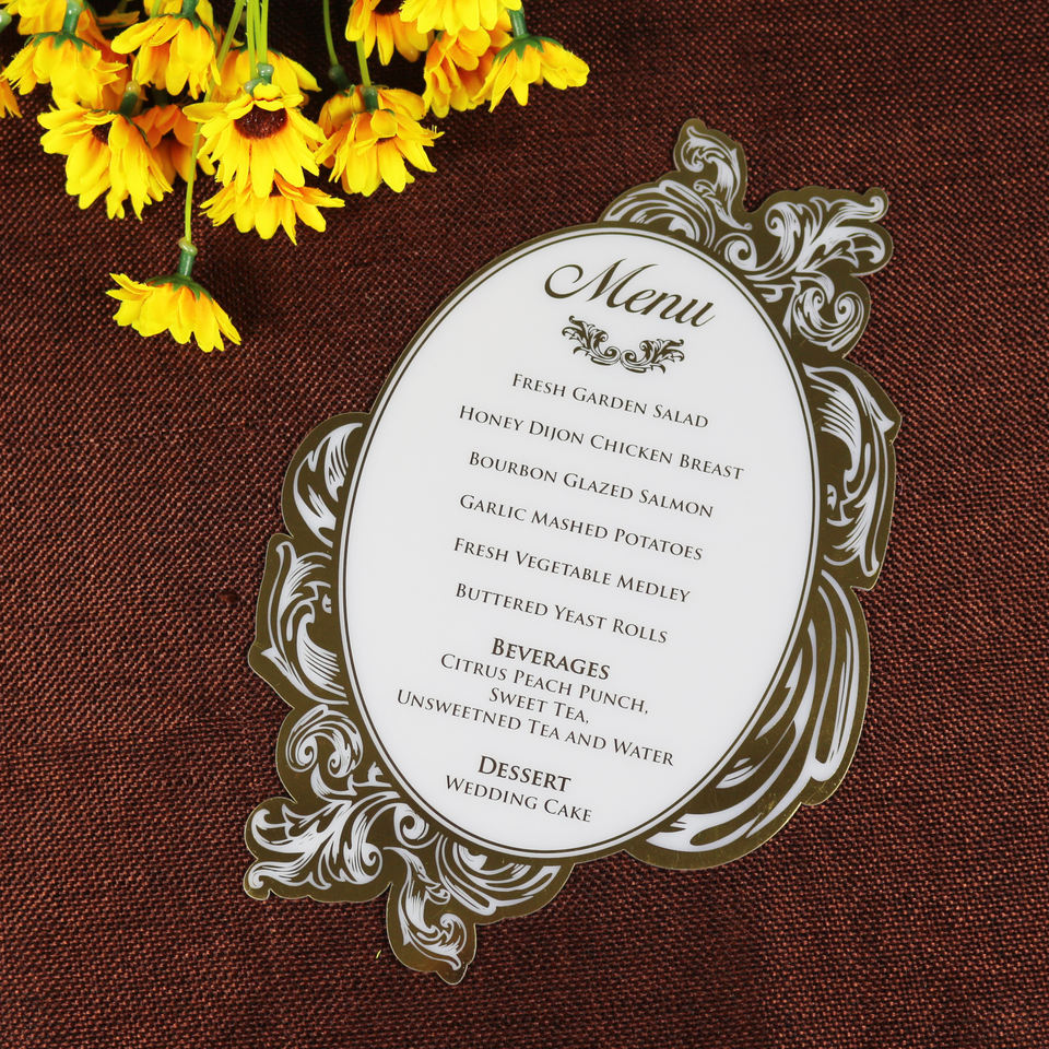 การ์ดเมนูงานแต่งงานที่หรูหราสไตล์รอยัลอะคริลิคสีขาวทองฟอยล์รูปทรงไดคัท
