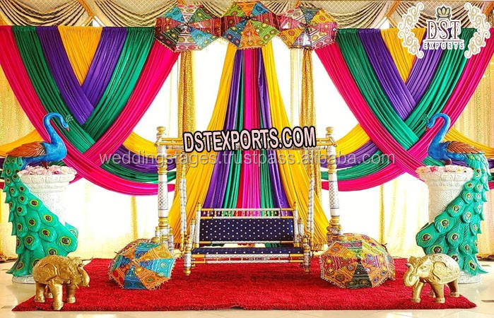 Royal Punjabi Mehandi Stage Decor Graceful Wedding Sangeet Stage Traditional Mehndi Setup Decoration