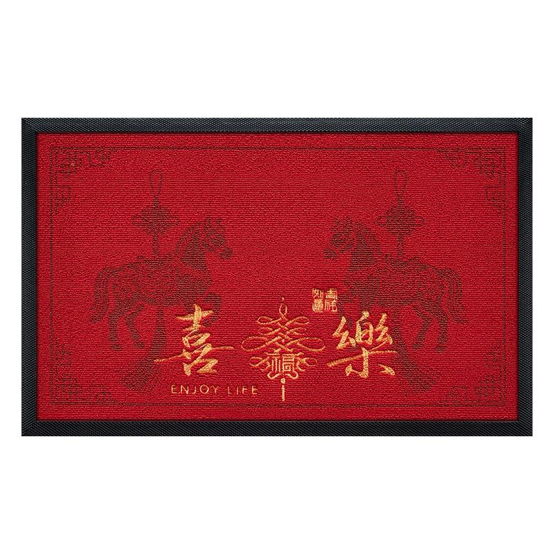 พรมเช็ดเท้าสีแดงทรงสี่เหลี่ยมผืนผ้า วัสดุผสม ปักลายม้ามงคลด้วยเลเซอร์ สำหรับใช้ในบ้าน