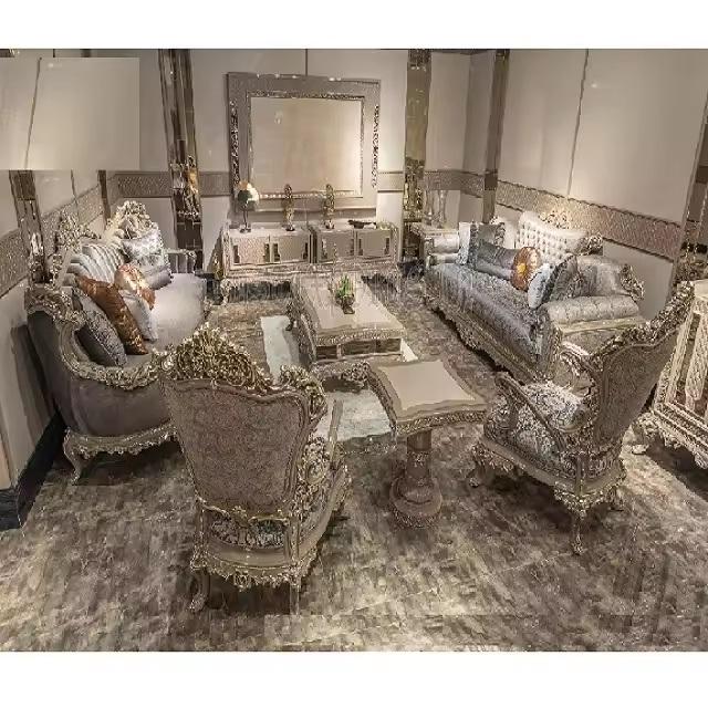 ชุดโซฟาห้องนั่งเล่นและทีวีสไตล์โรมันของราชวงศ์ชุดโซฟาห้องนั่งเล่นดีไซน์ตุรกีเซ็ตโซฟาไม้สักเนื้อแข็งแบบดั้งเดิม