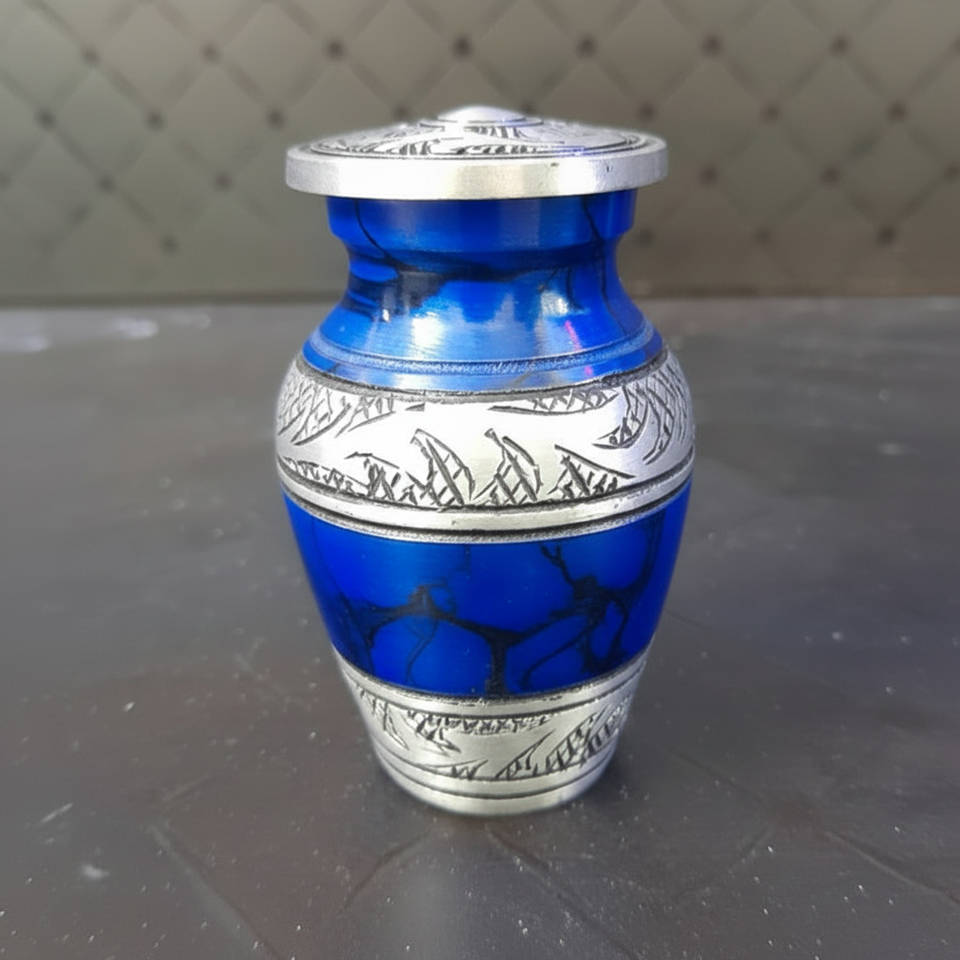 โกศเผาศพอลูมิเนียมขนาดเล็กสำหรับเถ้ากระดูกของมนุษย์สลักโลหะ columbarium keepsake สีน้ำเงินเข้มโดย ayaans