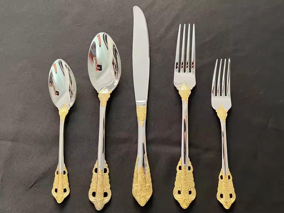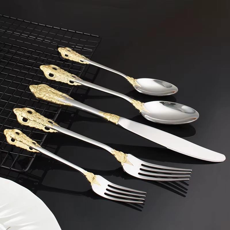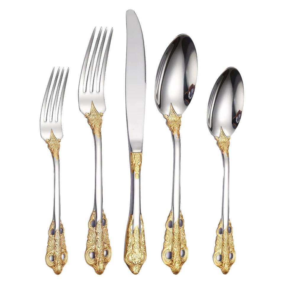 ชุดช้อนส้อมสแตนเลสดีไซเนอร์สไตล์ราชวงศ์ที่มีสีเงินดีไซน์ตามหลักสรีรศาสตร์ที่สมบูรณ์แบบสำหรับการรับประทานอาหารและให้เป็นของขวัญที่บ้าน