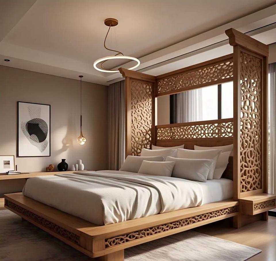 ชุดเฟอร์นิเจอร์ห้องนอนไม้สไตล์วิลล่าหรูหรา เตียงคิงไซส์ไม้แท้พร้อมดีไซน์แกะสลักสุดหรูสำหรับตกแต่งภายในอย่างอลังการ