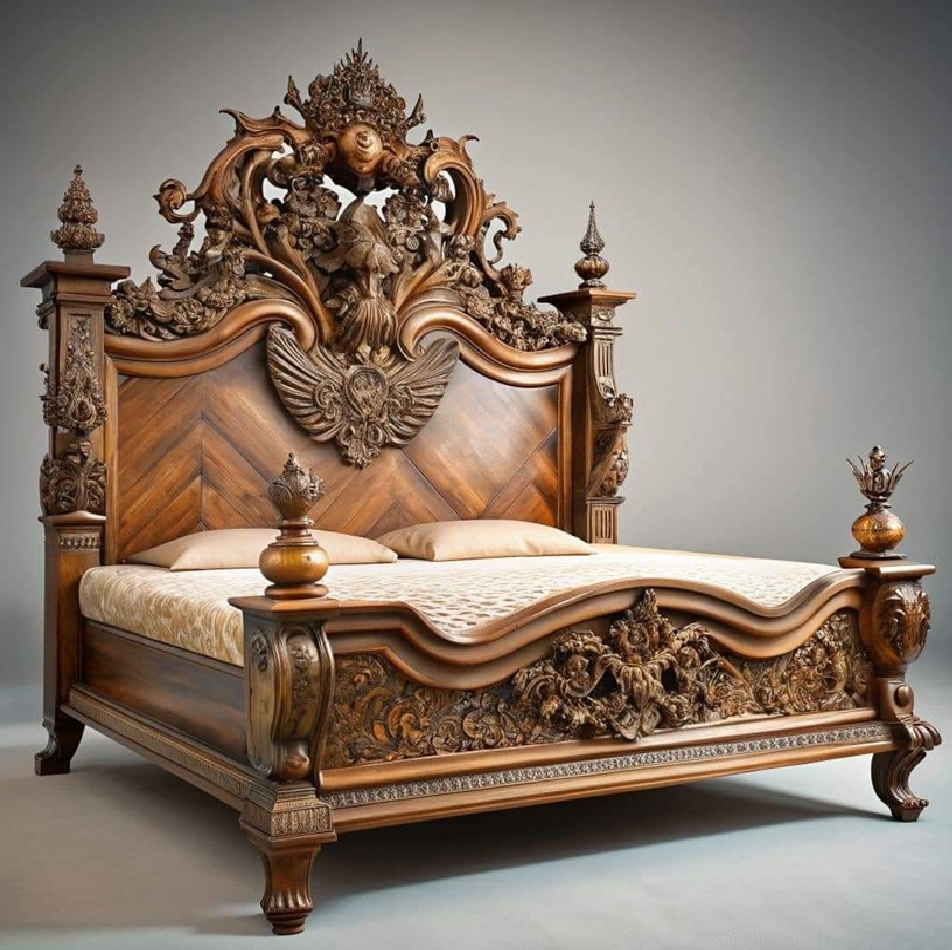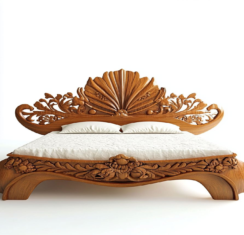 เตียงไม้สักทรงราชวงศ์พร้อมลวดลายดอกไม้แกะสลักด้วยมืออย่างประณีตและหัวเตียงโค้งทรงสง่างาม มีจำหน่ายในราคาขายส่ง