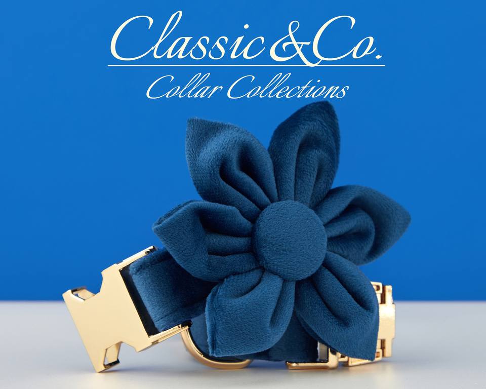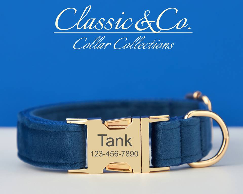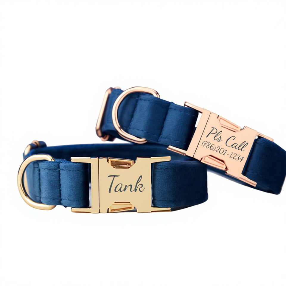 ชุดปลอกคอและสายจูงสุนัข Royalblue Veet แบบปรับแต่งได้ พร้อมโบว์ผูกคอรูปดอกไม้ ป้ายชื่อสลักทอง สำหรับงานแต่งงาน อุปกรณ์เสริมสำหรับลูกสุนัข ใช้ได้ทั้งเพศ