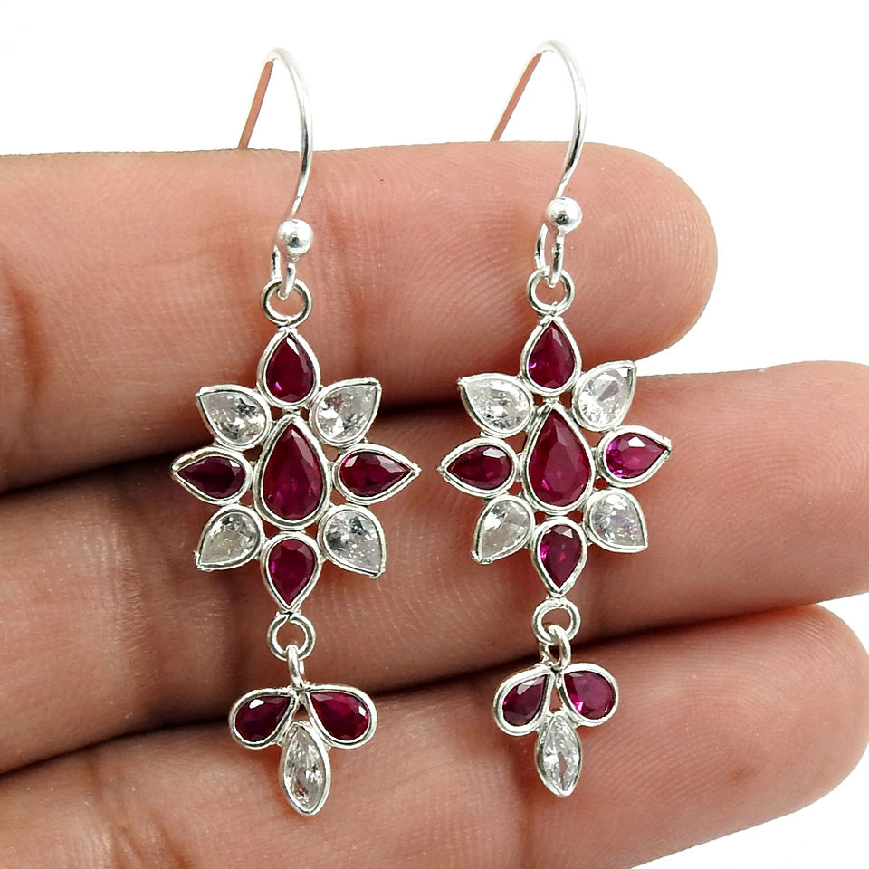ทับทิม CZ สีขาว CZ 925 เงินสเตอร์ลิงดอกไม้รูปร่างห้อยต่างหูผู้หญิงออกแบบที่กําหนดเองผู้ผลิตเครื่องประดับอินเดียผู้ส่งออก