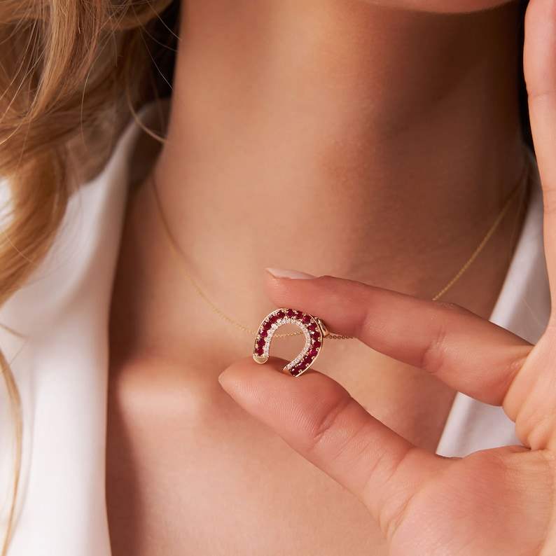 จี้รูปเกือกม้าประดับทับทิม เงินแท้ 925 ชุบทอง 14K เครื่องรางนำโชค สร้อยคอแบบเรียบหรู เหมาะสำหรับเป็นของขวัญหมั้นสำหรับเธอ