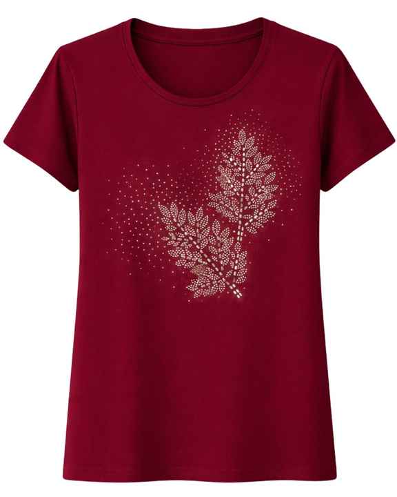 เสื้อยืดผู้หญิงสีแดงทับทิม ผ้าฝ้าย พิมพ์ลายดอกไม้ประดับเพชร แขนสั้น สไตล์ลำลอง เสื้อฤดูร้อน รับผลิตตามสั่ง โรงงาน OEM
