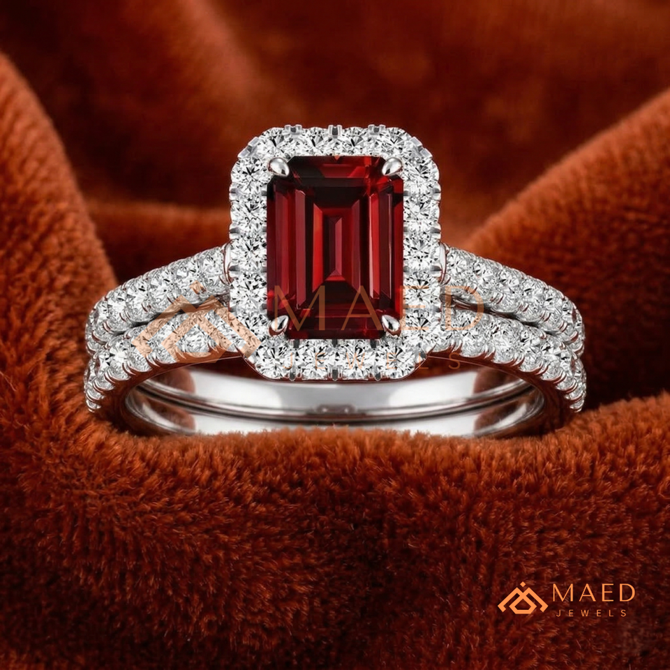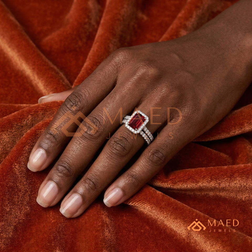 ชุดเครื่องประดับเจ้าสาวเพทายสีแดงทับทิม เงินแท้ 925 แหวนหมั้นทรงรัศมี พร้อมแหวนแต่งงานประดับมอสซาไนต์เข้าชุด แหวนสวยงามสำหรับผู้หญิง