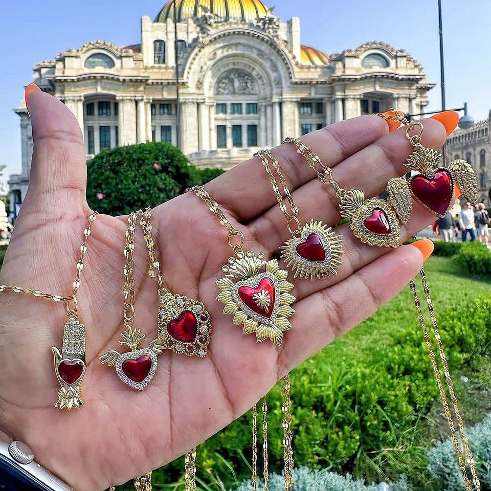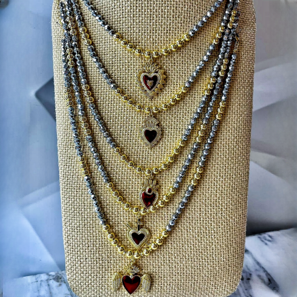 ทับทิมหัวใจศักดิ์สิทธิ์ของพระเยซูสร้อยคอจี้เครื่องรางทรงเรขาคณิตลูกปัดทองแดงเงินคริสตัลลูกปัดสร้อยคอโซ่ลูกปัดหรูหราสำหรับผู้หญิง